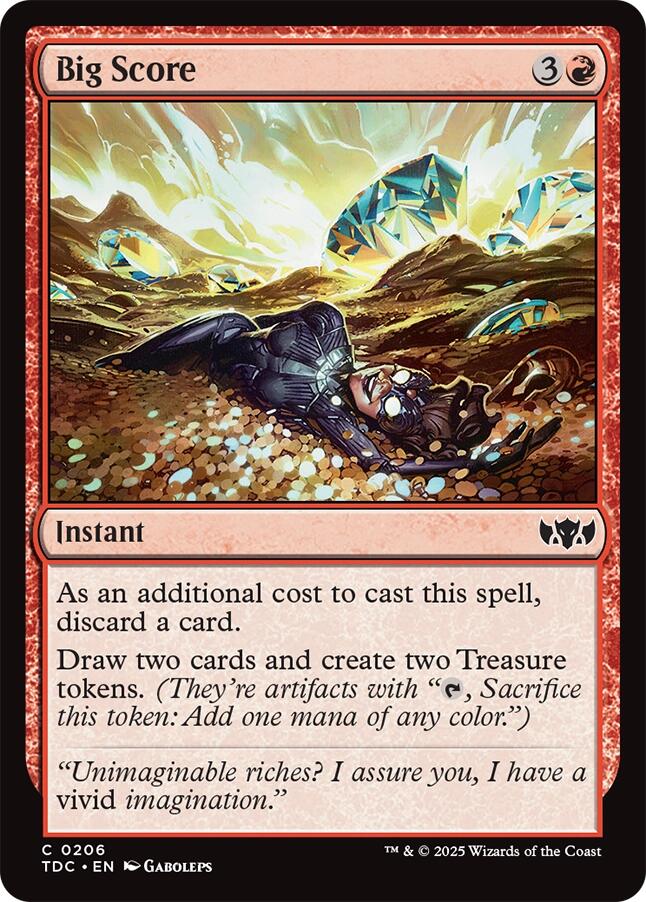 Draw two cards and create two Treasure tokens. (They're artifacts with "T, Sacrifice this token: Add one mana of any color.") - Flavor: "Unimaginable riches? I assure you, I have a vivid imagination."