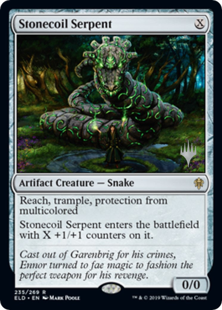 Stonecoil Serpent enters the battlefield with X +1/+1 counters on it. - Flavor: Cast out of Garenbrig for his crimes, Ennor turned to fae magic to fashion the perfect weapon for his revenge.